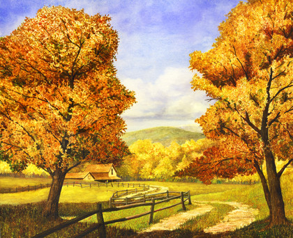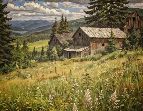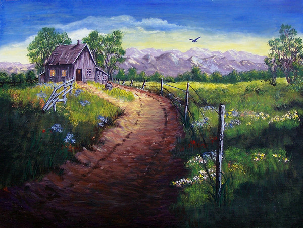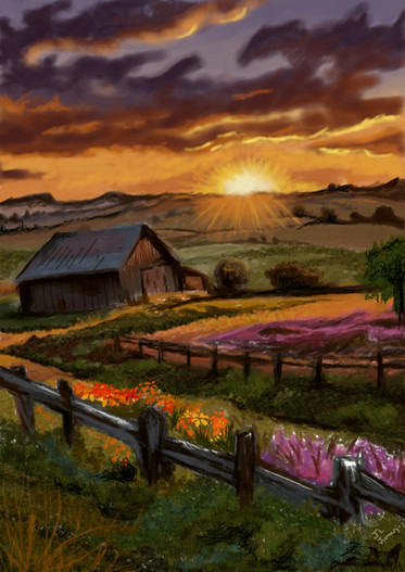 #barn #hills #landscape #oilpainting #rustic #scenic #serene #sunset #tranquil #trees