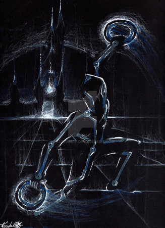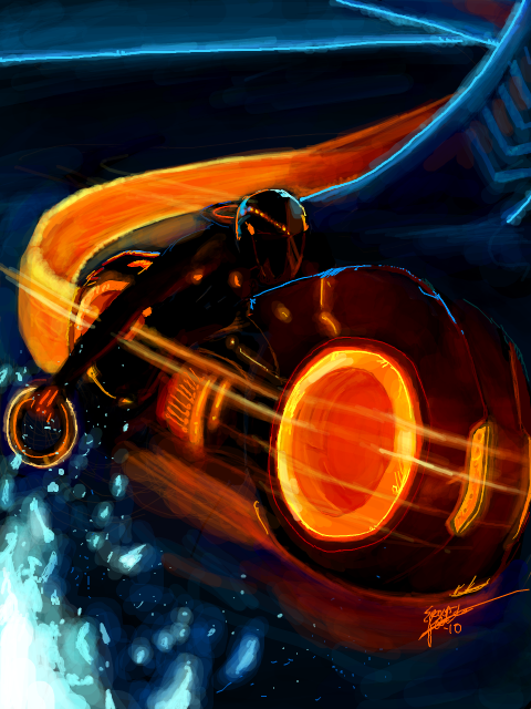 Love the design and flow to the piece and the minimal palette to convey the lightcycle and rider so well.