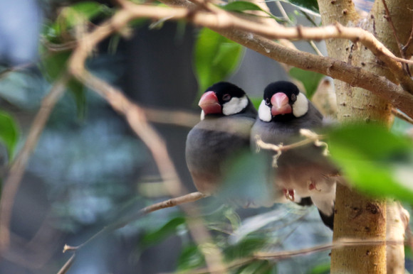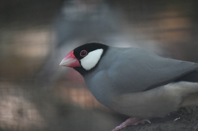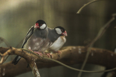 The Java sparrow (Lonchura oryzivora), also known as Java finch, Java rice sparrow or Java rice bird, is a small passerine bird .[2] This estrildid finch is a resident breeding bird in Java , Bali and Bawean in Indonesia . It is a popular cage bird , and has been introduced in a large number of other countries. Some taxonomists place this and the Timor sparrow in their own genus Padda.The Java sparrow is about 15–17 cm in length from the beak to its tip of tail feathers. The adult is unmistakable, with its grey upperparts and breast, pink belly, white-cheeked black head, red eye-ring, pink feet and thick red bill .