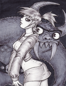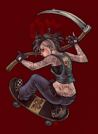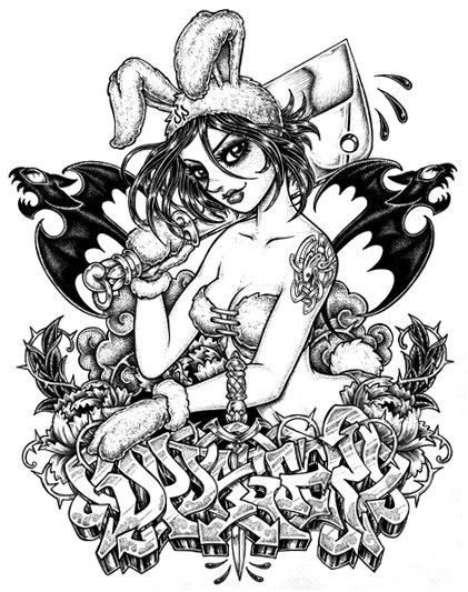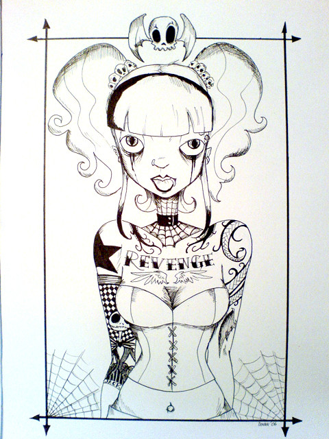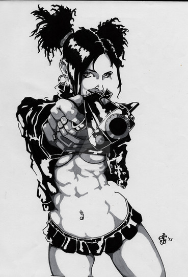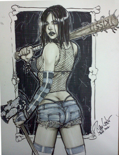 In my experience showing at galleries I noticed that the bulk of the people who collect art are artists, which means very little money. In an effort to cater to this market I wanted to do some drawings that don't take a really long time to complete.So I was having a conversation here on DA with about weapons, when I got the idea for this series of drawings. I call it "Choose Your Weapon." Each piece will feature a girl with a blunt or bladed weapon against a tattoo-esque backdrop. Obviously this one features the meat cleaver. I can finnish one of these in roughly two hours.