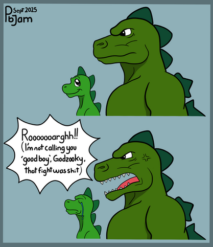 This has got to be one of your most poignant art pieces. This reflects on how some fans are ungrateful for unique and interesting ideas in the Godzilla franchise, whether they be the Scooby-Doo like Godzooky or Sony's Zilla with his dinosaur-like design. Now, another Godzilla-related fan controversy is taking center stage with Godzooky and Zilla. This is the juvenile Shin Godzilla, with its design, being somewhat adorable, reminiscent of a bird. Here, we can't help but feel sorry for all three of them. This is a great art piece, and I hope that Godzooky, Zilla and the juvenile Shin Godzilla can have their fair share of fans someday.