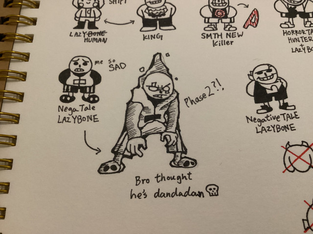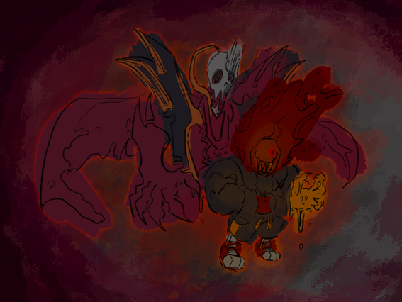 This guy is some messed-up version of Fell!Sans. It is little else than a ball of rage and anxiety (UNLIKe ME AT THE MOMENT), and storms about on a constant rampage, looking to destroy anything and everything in its path. If it can't, it only becomes angrier. It's hard to see sentience in it-- its mannerisms are animalistic, feral. Only occasionally does it stop, and only when it can go on no longer; it will enter a dormant state, typically a deep sleep followed by a period of sedentary rest. It is here that it is at its most reasonable, and very rarely may even show compassion when spoken to.