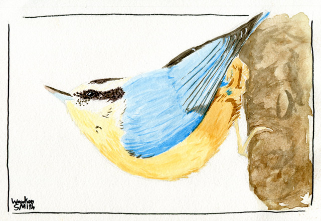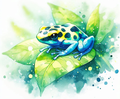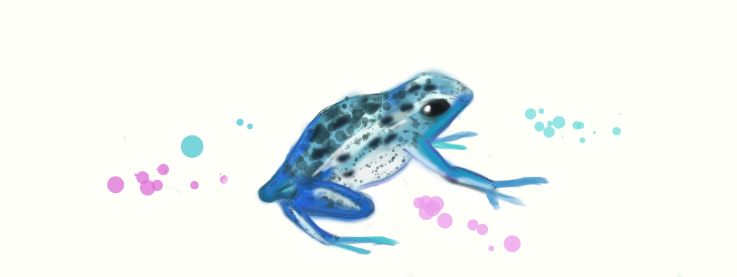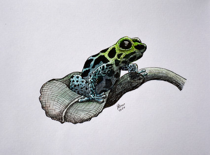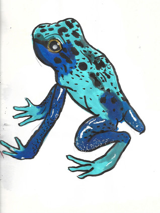 A blue poison dart frog, or Azureus dendrobates made with watercolors and black china ink.They live on the ground and among the plants, because their paws were not made for swimming. Their black spots are their own identification, as they are different to each frog. Their neon blue skin serves as a warning to predators of the poison they have.
