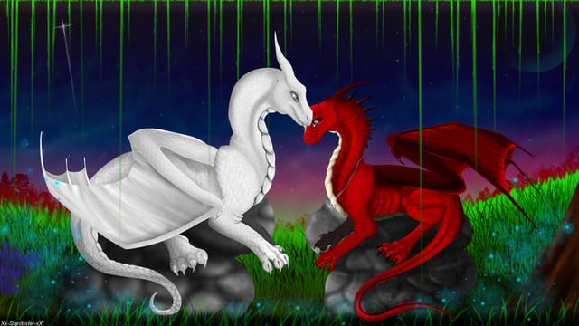Commission for of Kindle and Lasair enjoying their first date, do you recognize where they are?? They are up on the dam from DotD, I am not sure what view you might have of the dragon city from there, I couldn't find any reference so I used artistic license and imagination.
