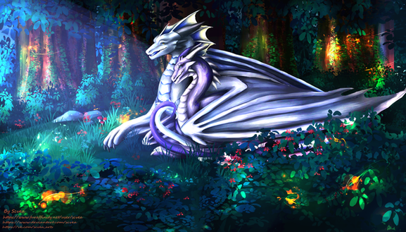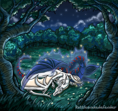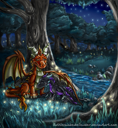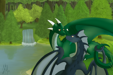 Commission for of his characters Zoloth (the gold one) and Rarenth (the black one)I really enjoyed doing the background for this one, since he requested a waterfall, I really wanted to do something different than the 'single stream of water flanked by two rocks' look. lol.