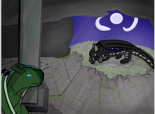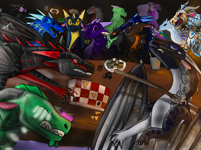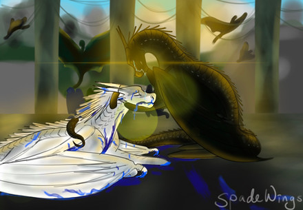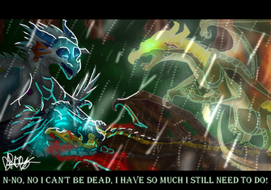 I cannot title my art WHYthis is from an au of mine called fires of destiny. Here is a very quick overview of the storyline. Instead of going off on her own in book 1, Peril goes with Kestrel. Kestrel does not die because Morrowseer and Blister know better than to mess with a firescales. They are found by the seawing patrol, and Peril wants to go in the summer palace to see Clay. She is not let in, but stays nearby. The events of book 2 are otherwise more or less the same. Webs does not get injured by Blister because Peril. Instead of going to the rainforest the group heads off to the Scorpion den. They meet Blaze and ally with Thorn. Kestrel gets a redemption arc. Meanwhile, the alternate dod are sent on a mission: gain the trust of the dod and anyone with them, kill Peril, and if you kill your respective dragonet you get to replace them. Also, kill Webs and Kestrel. Fatespeaker won’t do any of these things, and is certain that Orche, Squid, Flame, and Viper wouldn’t either. Unfortunately, she is incorrect. One night, the alternate dod invite Peril to go swimming. Once she was in the water, she was attacked. Fatespeaker, horrified, tries to get them to stop, so Viper attacks her. After a while Squid, who has just been watching all of this go down, freaks out and runs away. Flame chases him. Squid’s yelling attracts a patrol, which manages to save Peril and Fatespeaker, have nasty wounds and scars from the incident.