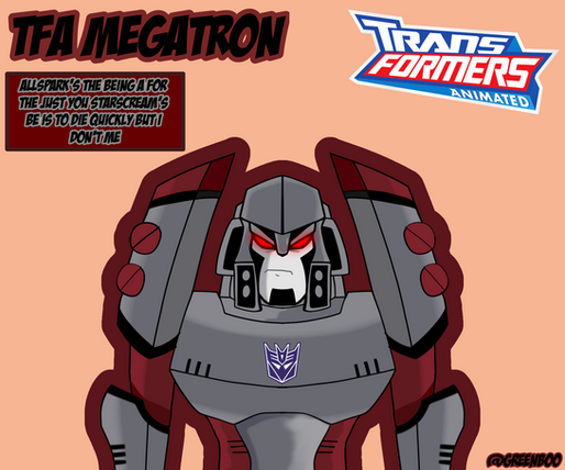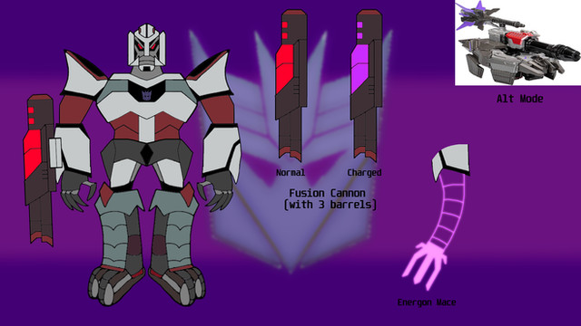 Mark Hamill was chosen because I am a big fan of his. This Megatron has some similarities with Darth Vader, including his past and torturing his own henchmen. Because of his vanity and hatred for organic life, he is the only Decepticon who keeps his original Cybertronian alternate mode.