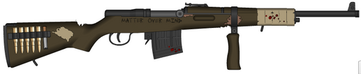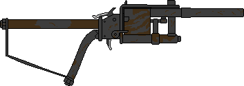 Karin's Huot Automatic Rifle, painted with gold and decorated with cloths marked with symbols, it fires a whopping 475 rounds/min (cyclic), 155 rounds/min (continuous) and is reloaded via a 25 round drum.The huot Automatic rifle was made in real life by Joseph Alphonse Huot (1918) and was made in a attempt to combat the shortage of light machine guns in 1916 when the Canadian Expeditionary Force was lacking firepower in reguard to automatic weapons, sadly the huot never saw much use outside of military trials.