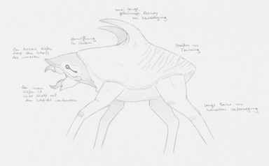 Its jaw is divided into 4 pieces, which in the interior have 4 tentacles similar to the arms of a squid, with each tip covered with thousands of spines.Β Its large and very thick tail maintains a complex organ that processes a variety of chemicals that when they get together and be expelled in the opening above the head which produces a thermal reaction similar to a Bombardier beetle, however, on a larger scale.