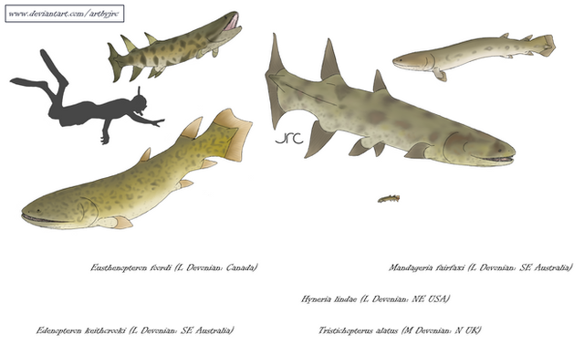 Starting with the most prominent and probably the most relevant of the groups of the time, Sarcopterygii were among some of the thriving groups under the seas and freshwater as since the start of the Devonian, they were very varied in body shape and size with different behaviors similar to bony fishes in most cases being carnivorous species, some of minimal size, and other obtained major lengths allowed them to become the apex predators in freshwater environments.