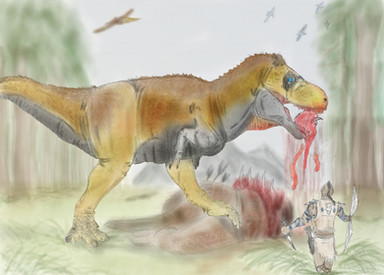 In another of the Alternative universes in which non-avian dinosaurs escaped of their fatal fate, something interesting happened with the Tyran predators of the cretaceous.The Sagaxotyrannus proves to be a very specialized form tyrannosaur which has developed a large brain, which allows it to develop a huge intelligence and cognitive abilities. It is a species that appeared during the Pliocene at the peak of the decline of global temperatures. they are a nomadic speces, having a huge range of distribution throughout Asia and eastern Europe. They have a fairly established social structure, with the adult male as a leader, a female beside him and several other young and adult siblings below this one. Males which want to get the title of leader or should challenge the adult in charge but for the sons of the leader, thes must pass by a hunter rite which is to catch prey and the fiercest fighters such as the horned dinosaurs. They are in an advanced stage at the age of metals, capable of making iron tools.