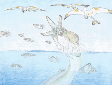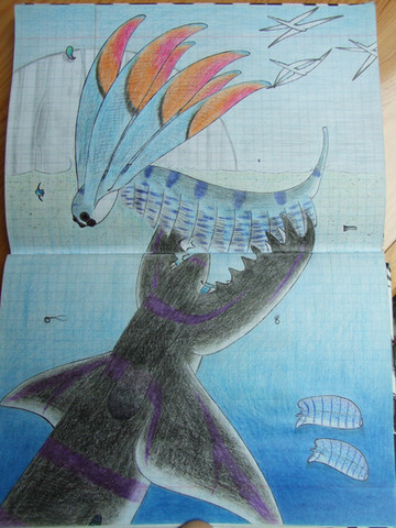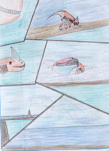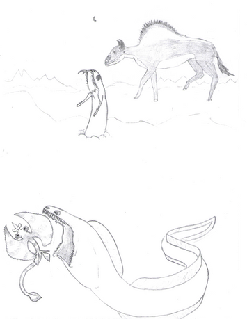 This was something I did several years ago, I think by 2008 when I was starting my interest in speculative evolution.A small group of Rape Turtle (Phobochelys molestor) roam the beach in Mapag, one of them found the remains of a Hadrocetoides balabani, which ran aground and now is the food of the trikers.