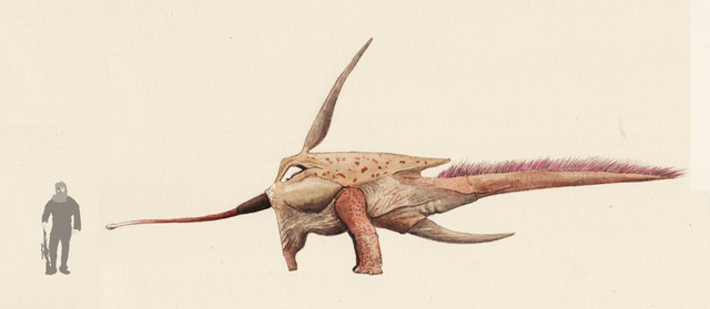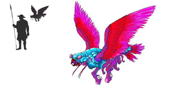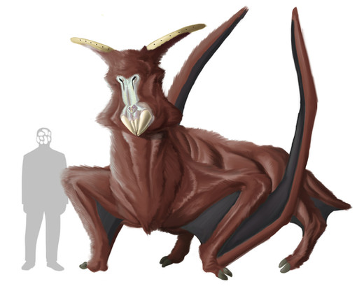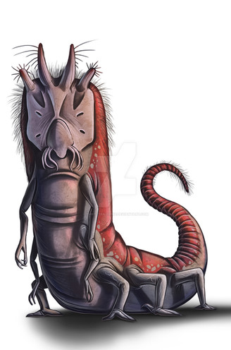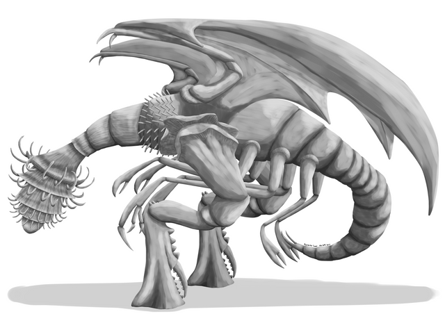 “They were pinkish things about five feet long; with crustaceous bodies bearing vast pairs of dorsal fins or membraneous wings and several sets of articulated limbs, and with a sort of convoluted ellipsoid, covered with multitudes of very short antennae, where a head would ordinarily be.... As it was, nearly all the rumours had several points in common; averring that the creatures were a sort of huge, light-red crab with many pairs of legs and with two great bat-like wings in the middle of their back. They sometimes walked on all their legs, and sometimes on the hindmost pair only, using the others to convey large objects of indeterminate nature. On one occasion they were spied in considerable numbers, a detachment of them wading along a shallow woodland watercourse three abreast in evidently disciplined formation. Once a specimen was seen flying—launching itself from the top of a bald, lonely hill at night and vanishing in the sky after its great flapping wings had been silhouetted an instant against the full moon.” H.P. Lovecraft, The Whisperer in Darkness