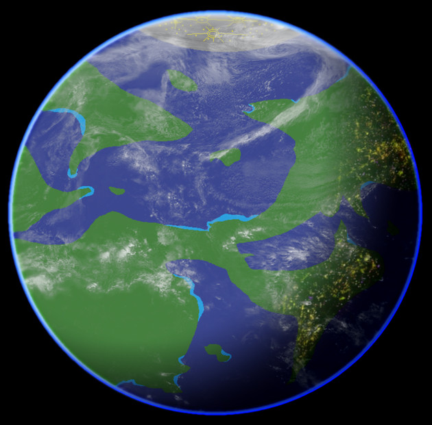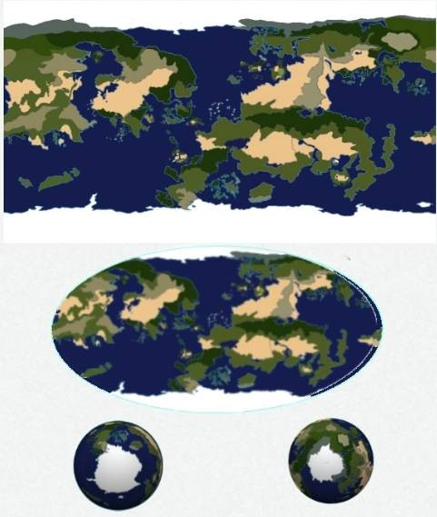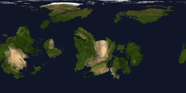 We will start with a basic map of the world, showing the basic climactic zones. The world is divided effectively into two vast regions, significantly different in flora and fauna due to the inhibition of biological exchange resulting from the great equatorial icecap."