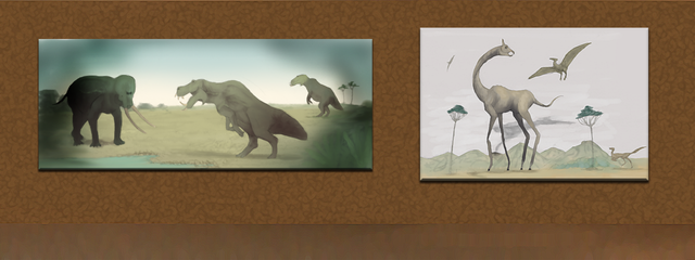 Uno de estos ejemplos se expone en el engullidor, uno de los “pterosaurios del terror” más grande que han existido, con alrededor de 3 metros de largos, ha capturado un pequeño ornitópodos cuadrúpedo. Ellos habitaron en norte de áfrica hace 55 millones de años.