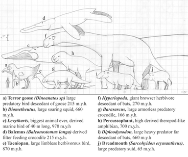 Los Apterodactilos son un diverso suborden de pterosaurios terrestres que surgieron durante el cretácico, después de una extinción en masa a principios de este periodo, a partir de especies arbóreas que avanzaron a tierra hace 70 millones de años. Después del evento Cretácico/Paleógeno llegaron a desarrollar una enorme diversidad sin la competencia de otros grandes animales, convirtiéndose en uno de los grupos dominantes de la megafauna a principios del cenozoico.