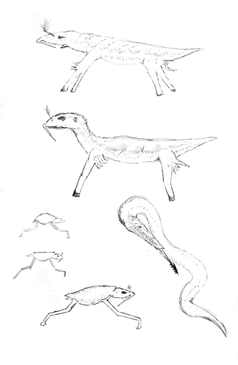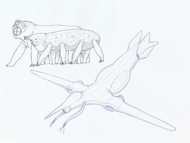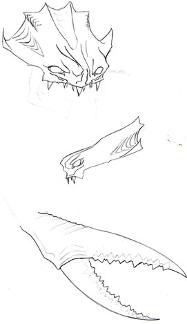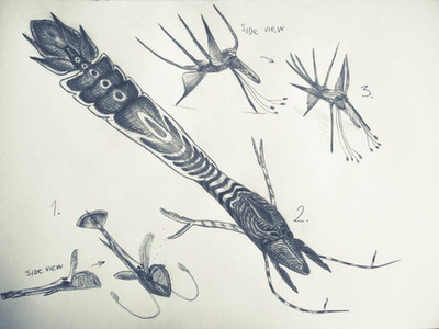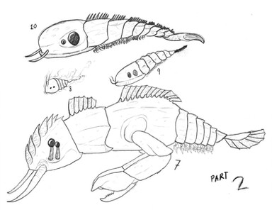 These are some designs of probable descendants of the OpabiniaUp: The Manglerworms are a parasitic species that eats organic compounds that make up the trunks of treeworms (A special lcase invertebrate that has evolved to take the role of the flora)