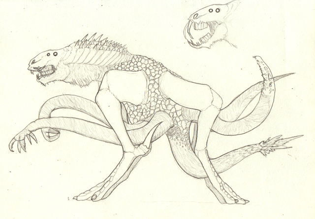 one of these creatures, was the hydras . were common lizards ( monitor lizards ) genetically modified, so that does not look anything like any reptile. because a body with multiple heads might not survive long-term , human gods thought best to modify their appendages so that they look like heads. large jaws that are contoured on one side to the other of this animal were , fingers modified as the slenderman. were ambush predators capable of killing a man to bite. mediate more than 6 m long, and weighed 500 kg. for centuries these creatures invaded several worlds becoming dominant predators , even years after the war. the end of this species came to when civilizations decided to begin a program of controlled extinction