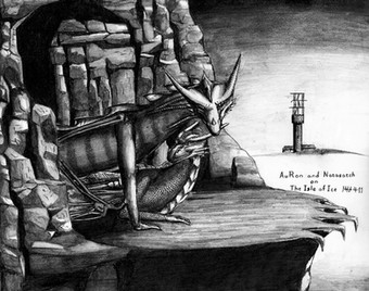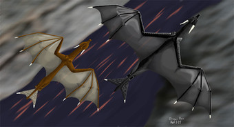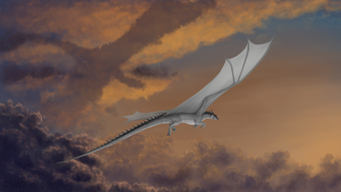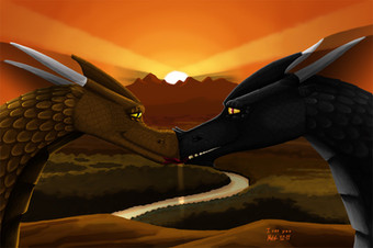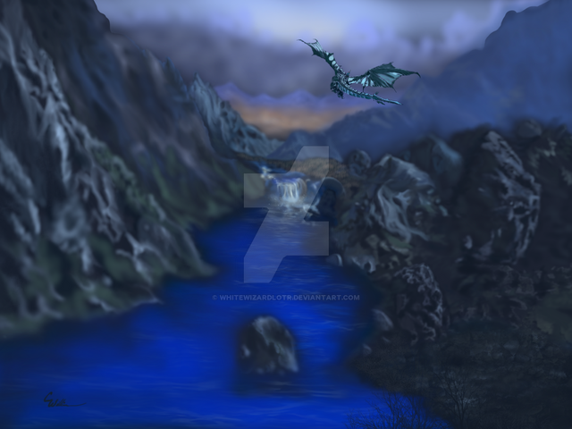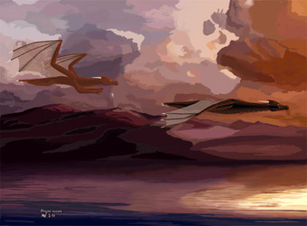 The days first light starts to fill the sky as a pair of dragons fly high above a foggy mountain valley.The dragons are Falkener and Scorch, both OCs of mine. The sky is from a photo I took. Not too entirely pleased the results of this, the hills look kind of weird and the fog just doesnt look right even though I used many layers on it.