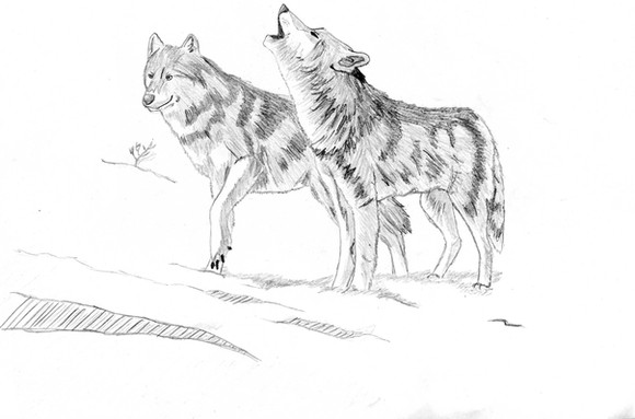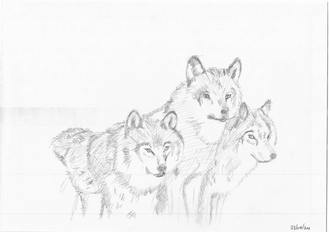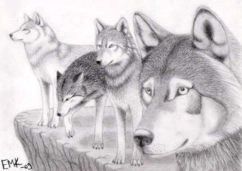 Three White Wolves...Three blind mice...change the lyrics and it kind of fits.When I started on this, I wanted to work on my ability to draw from pictures so I used references from and to create the above image. I, of course, had to put my own spin on it and not make it exactly like the photos.