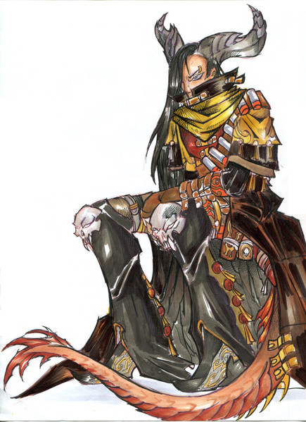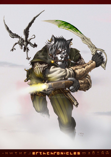 The coast a little clearer, Shade got up and scanned the brawlers more closely, unable to see his friend until he got a clear view to the bar, at one end of which a small fire was burning. The shelves in the wall behind that normally held bottles and glasses were smashed in one place. Below the point of impact pair of black boots with metal shin-guards and spikes on the toecaps was sticking up, accompanied by a spined black tail. Shade muttered a curse, set his teeth then sprinted through the gap in the fighters, dodging random punches and jumping prone bodies until he vaulted over the bar (having barely recovered from a skid in a pool of blood and spilt beer). His jump was poor and he yelped as he overbalanced and landed on his backside in broken glass.