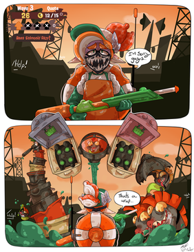 I love the idea that Salmon Run involves squid kids being sent to do a very life-threatening job by a painfully obvious shady business.