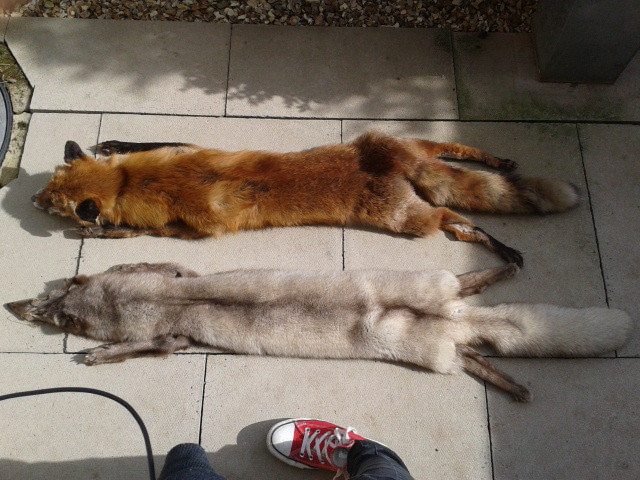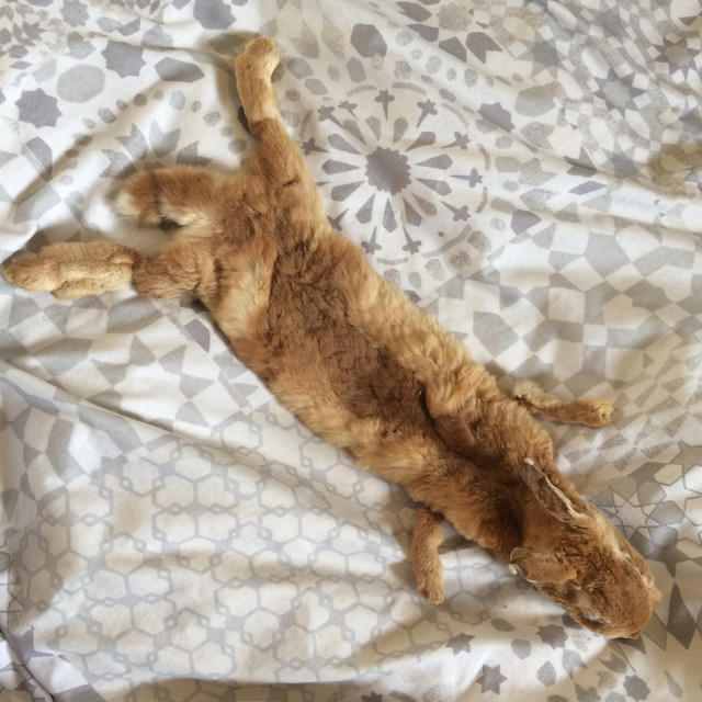 An example of the rabbits I ordered, they all look the same more or less. All bloody and stuff, a few have broken legs but I can work with that... I think these are going to be tanning practice, since they're not the best by the looks of it. They're smaller than I imagined, but then again they are wild. I'm going to be keeping and preserving their skeletons.