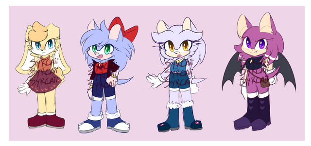 From left to RightSonic and Amy's child, fast hedgehog trying to live up to her fathers legacy), (Tails and Cream's child, small and sweet with a hidden temper), (Knuckles and Rouge child, sensitive and shy trying to become confident), (Blaze and Silvers first child, slightly mischeavious prince) and (Jet and Wave's first child, who loves racing and music).