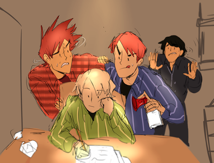 Awesome facial expressions! Really love how lively this drawing is, good work