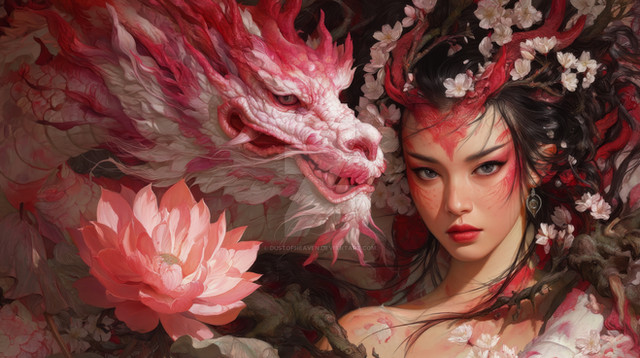 Contrast between the dark dragon and the "colorful" warrior.