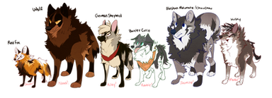 Wolves: small, wide ears, fluffy, short bushy tail, big paws, long legs, muscles, etc.