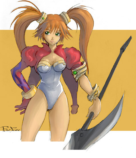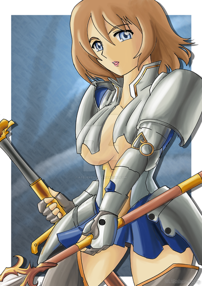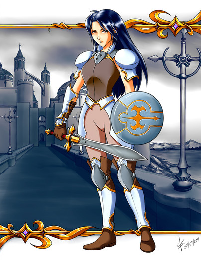 She looks really cool, nice armour design even if it is simple, it still looks good. Nice big chest like we like 'em Her sword blade has a cool design too.