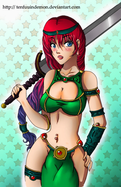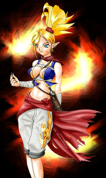 i really like the flame in the background it makes her look more magical then simply a brut. however the way she looks kinda pissed off at someone makes her look really sexy, too. ^^