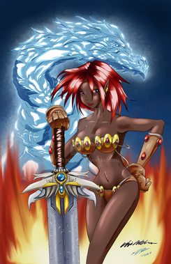 This one's a commission.I'm quite happy with how it turned out. I wasn't asked to do a background, but doing the whole magical burny sword thing seemed a good way to get around the problem of having a big, empty, boring space behind her. It also gave me an excuse to go nuts with the lights, which is something I haven't really done all that much for a while.