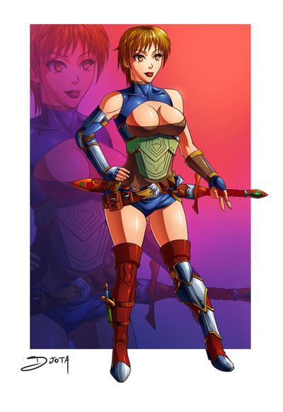 Really super looking colors the highlights and shading are really awesome looking and i like the glowing flame rune etchings on the sword shes swinging.