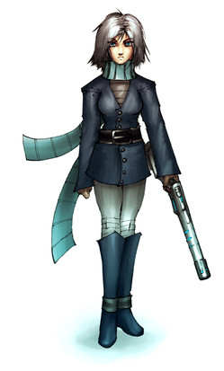 I first thought this was more of a fantasy/medieval character because of the outfit, and then I realized she's holding a huge cannon. Then I started noticing more modern-looking elements like the boots and kneepads. It's a very cool look.