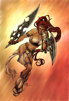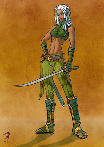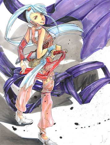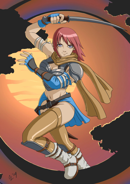 I was diddling around with the way I coloured this and accidentally happened across something that I *think* looks quite cool. Of course, I might change my mind about it over the course of the next few days, so don't be surprised if this picture is suddenly replaced with a more boring, "normal" cel-shaded version thingy.Why the title? Well, because the picture was only really intended to be a doodle in the first place, and because there's nothing particularly ninja-like about her any more.