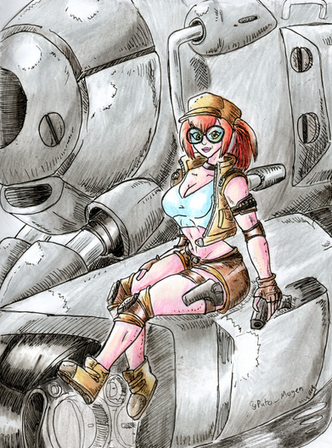 The title doesn't really fit the picture, but it popped into my head and amused me (and maybe I'll explain why in a bit...)This was a sketch that I ended up liking enough to want to finish off - the original sketch itself should be hidden away in my scraps somewhere. Someone (sorry, forgot your name... shameful!) sent me a note suggesting I should draw Aryn, and I was getting that impression myself after flicking through some of my old art and finding at least one of the Aryn pics to be one of my favourites. So... yeah, I drew her in a generic sitting-down pose, and then figured it might be a good idea to draw her something to sit on... and since she's into guns and stuff, and since I have a strange fixation with tanks, I thought that would be a good setting.