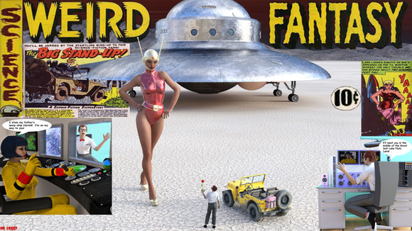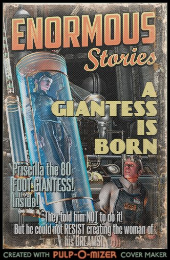 I got the inspiration for this render from the Sci Fi Pulp magazine picture displayed within it. I thought it would somehow look a little more to the viewer's taste if I switched the gender of the Giant to a Giantess.I just love those old artistic drawings though and can't get enough of them obviously. It seems that with the modern comic style so much is lost to the infusion of anime and other styles that make the scenes look like a spilled plate of spaghetti and meatballs with the prime characters and ideas lost in the noise. I wish comics would return to a direct approach as was done in Golden and Silver age comic-mags. I think that some artists are catching on to what was lost as of late and are trying to return to that better medium of representation and have hope that the old style will some day rule the visual spectrum of what is available to the general public once again. We can only hope I suppose.