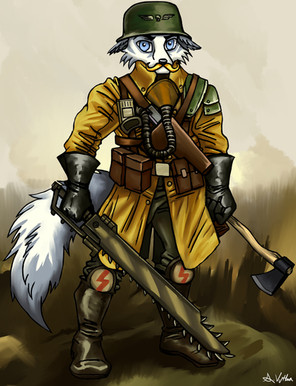 An example of traditional field medicine amongst the ranks of the Last Legion. Catkin such as Kitty LeChat here are frequently employed as forward scouts, snipers, and field medics with their fast reflexes and balance making them ideal for sprinting across the battlefield to help those in need. Since Kitty's attached to the Ironside Corps, she wears a suit of their traditional heavy clockwork-augmented armor, and makes up for her hindered speed by carrying a shield and scattergun for plowing her way forward towards her patients. Most of the lads would prefer one of the typical Catkin nurses to tend to their wounds instead of the Iron Maiden, but when your arm's been blown off with a cannon shell, you take what you can get.