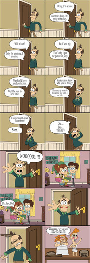 Artwork made by artist Alejindio .A patriarch of a Loud family is having technical difficulties trying to change a channel on a television...