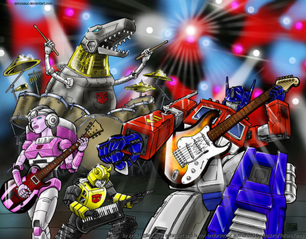 This is all sorts of epic, and while you do have good and evil here it dose sort of make a tiny bit of sense. Soundwave and Blaster both turn into boom boxes so they play music, Jazz..well...jazz is a type of music. As for Rumble and Frenzy...well...they like hitting things alot so they just got to play drums.