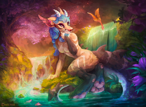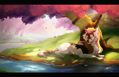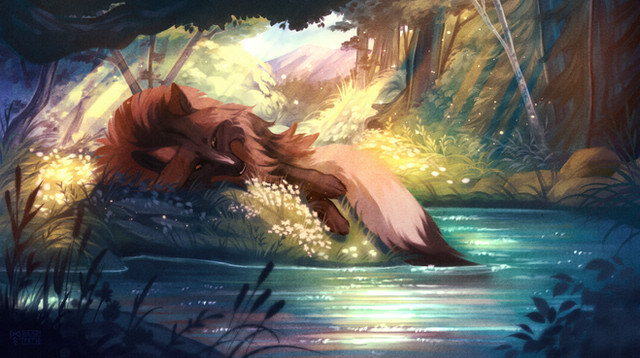#2020 #blossom #canine #character #dawn #digital #dusk #fantasy #fox #furry #illustration #kala #mikala #painting #photoshop #pond #sunset #wolf #werkman #art