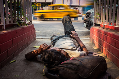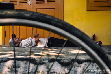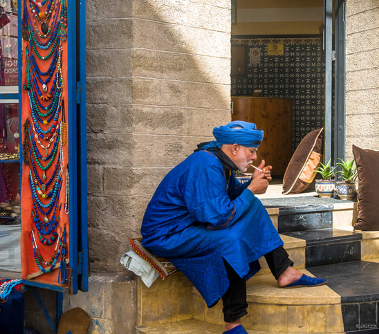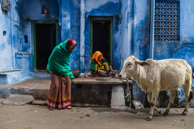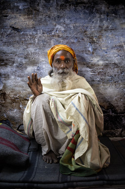 Indian man wearing a red turban sits outside his house on the street during Holi in Barsana, Uttar Pradesh, India.www.drewhopperphotography.com