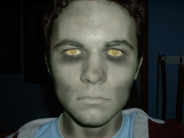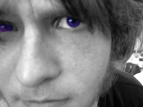 I took a photograph of myself with Photo Booth, and then I used Photoshop to add in the Rinnegan eyes (from Masashi Kishimoto's manga series, Naruto). I used the picture of the Rinnegan sclera contact lenses from [link] , and I edited it to change the color and fit my eyes.Related content
