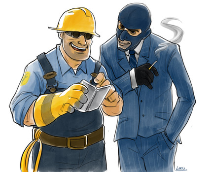 That spy face...THAT SPY FACE. It's gotta be the GREATEST spy face ever. FFF I can't get over it. I love it. LOVE IT. Also I'm diggin on the Engi's thumb. :I