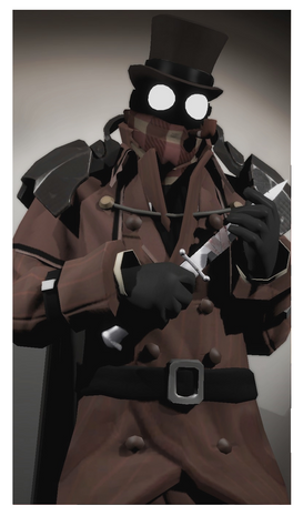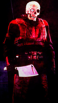 He wears a gray suit and black finger-less gloves, he covers his face with a gas-mask, I wonder what is it in there.