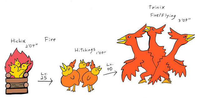 I've been wanting to do one of these for a while now, so I figured that I'd do variations on my favorite starter. I'm not too fussed about the appearance, this is just a doodle, after all."The Cinders breed is known for its devious, territorial nature and its dark coloration. They will often mark the borders of its territory with its claws and chase off any interlopers. They are well suited to cold climates and experienced trainers."