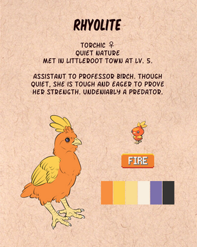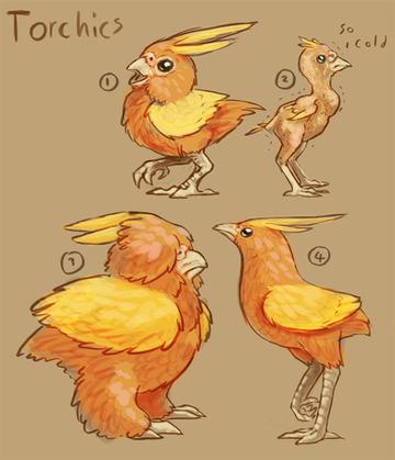 "The Junglefowl breed is harder to see than most, choosing to nest in the branches of trees. Their long legs and larger than average wings allow them to be the fastest of torchic variations. Their long beaks are able to dig through tree bark to get insects that others of their species could not. They are recommended only for experienced trainers."