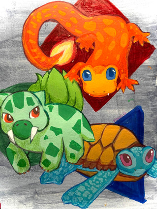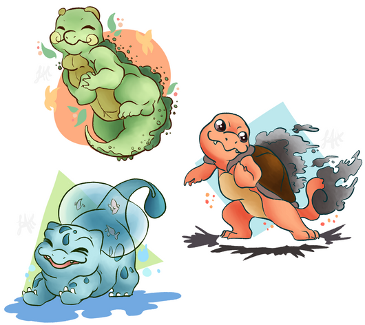 I drew them more in my own style just to see how they'd turn out, I actually really like it! I've always seen bulbasaur as a kind of dinosaur lizard with hints of cat, mainly the ears, so I tried to reflect that here. Squirtle and charmander are obviously a turtle and a lizard so I drew 'em like that.